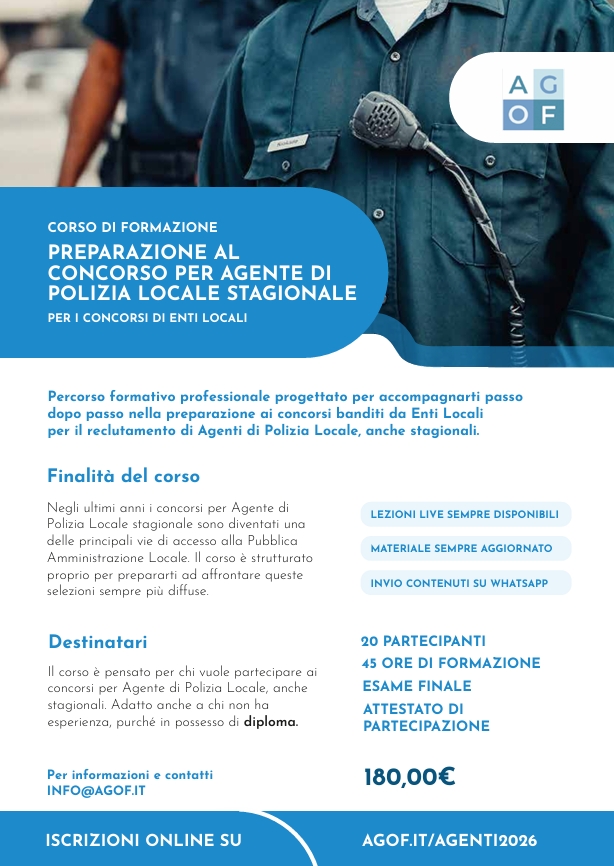 Percorso formativo professionale progettato per accompagnarti passo dopo passo nella preparazione ai concorsi banditi da Enti Locali per il reclutamento di Agenti di Polizia Locale, anche stagionali.