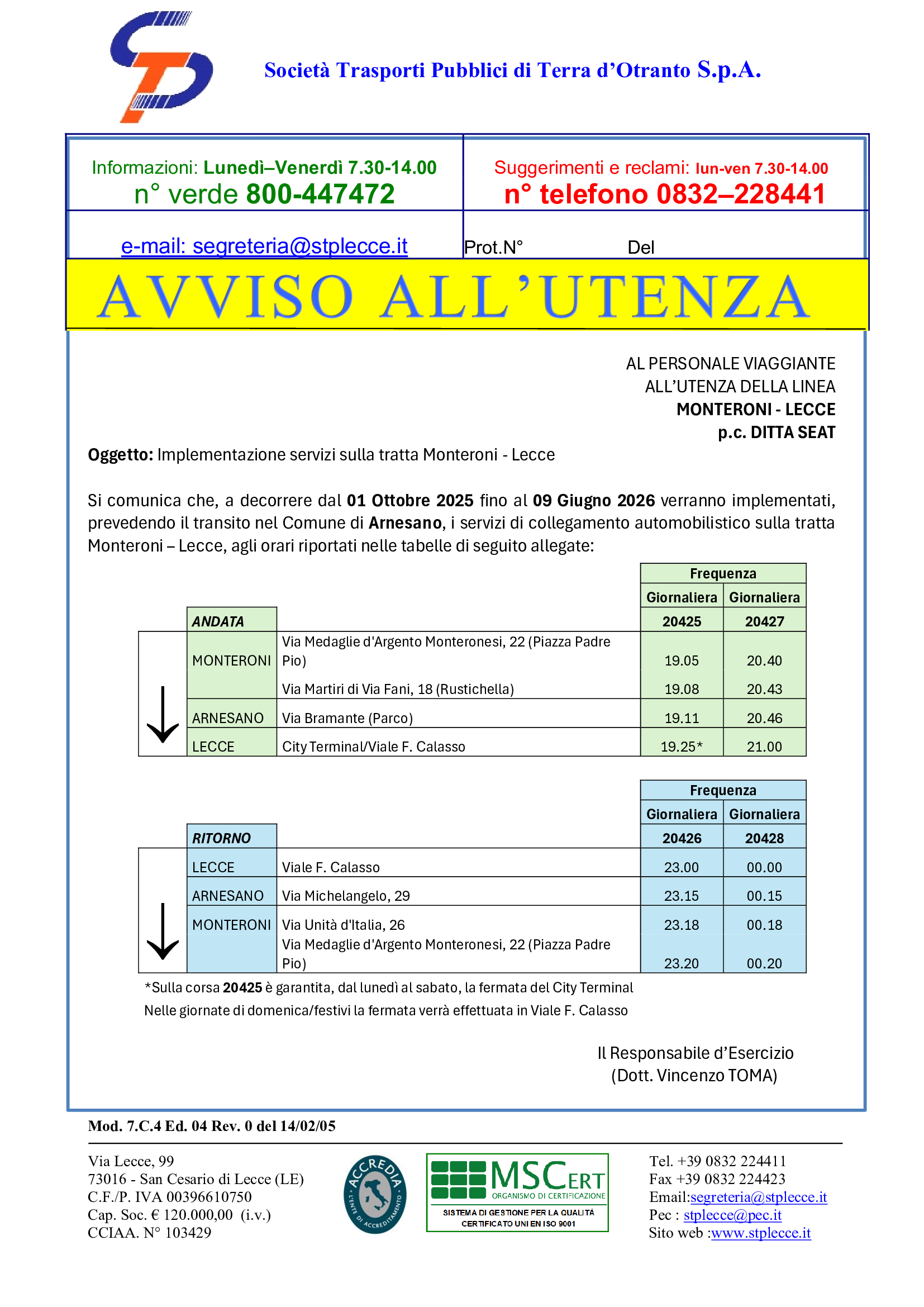 Si comunica che, a decorrere dal 01 Ottobre 2025 fino al 09 Giugno 2026 verranno implementati,