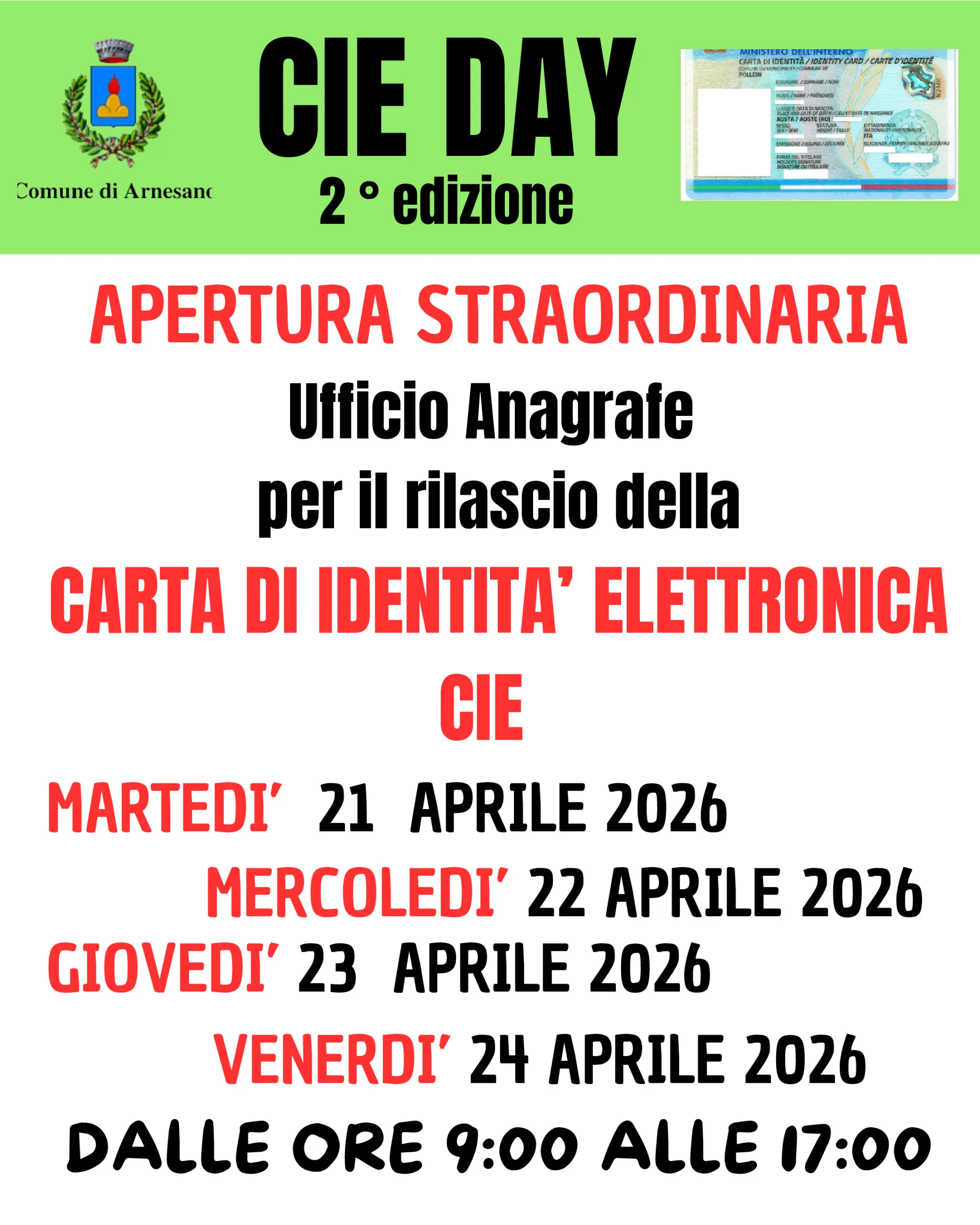 Apertura straordinaria dell'Ufficio Anagrafe per il rilascio della CIE - Carta d'Identità Elettronica