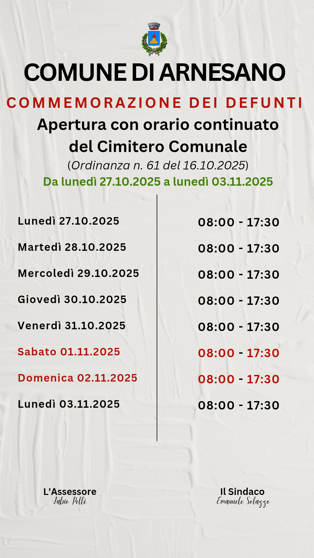 L’Amministrazione Comunale informa la cittadinanza che, in segno di rispetto e partecipazione al ricordo dei cari estinti, il Cimitero resterà aperto con orario continuato.