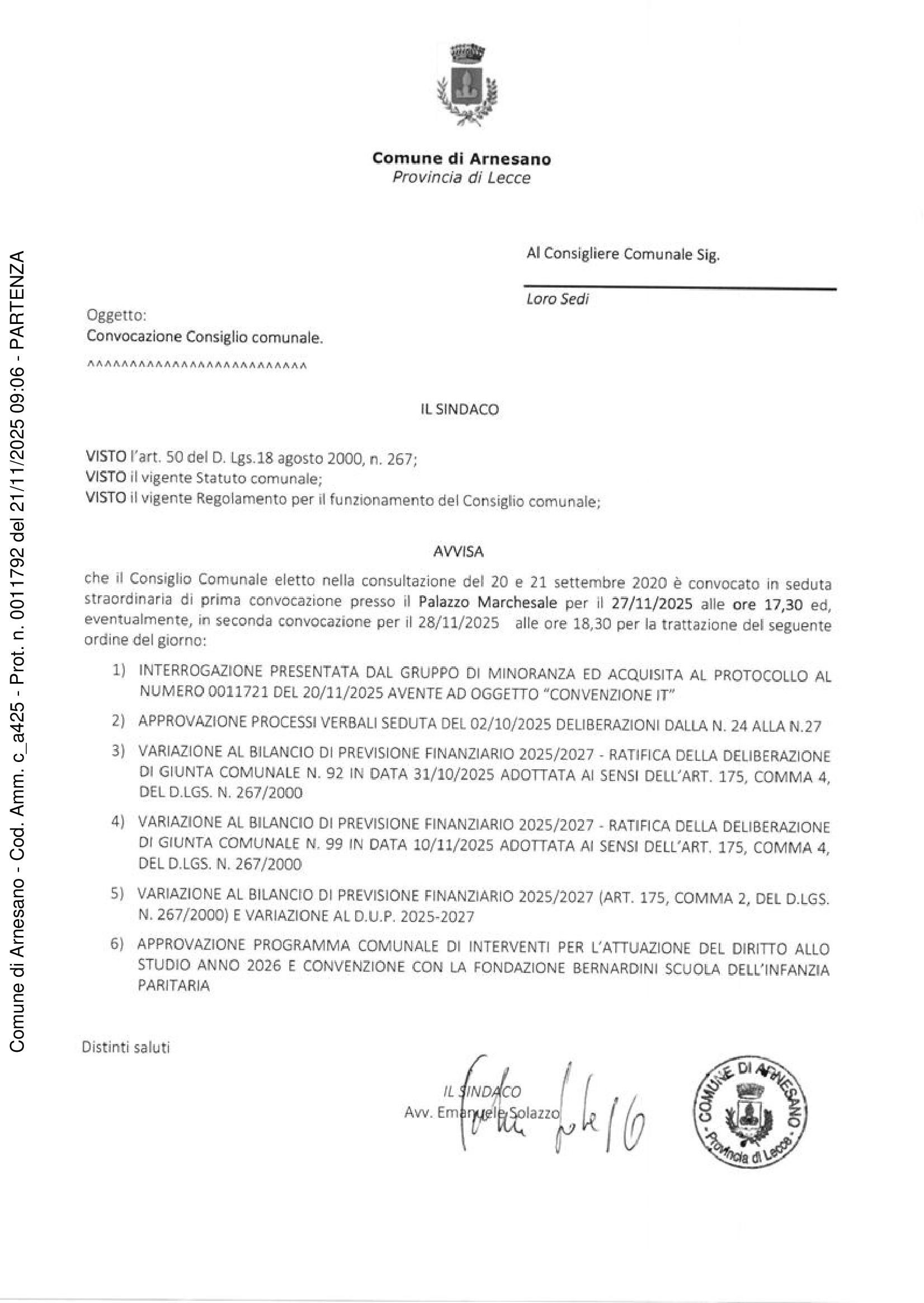 - Interrogazione presentata dal gruppo di minoranza ed acquisita al protocollo al numero 0011721 del 20/11/2025 avente ad oggetto “Convenzione IT”