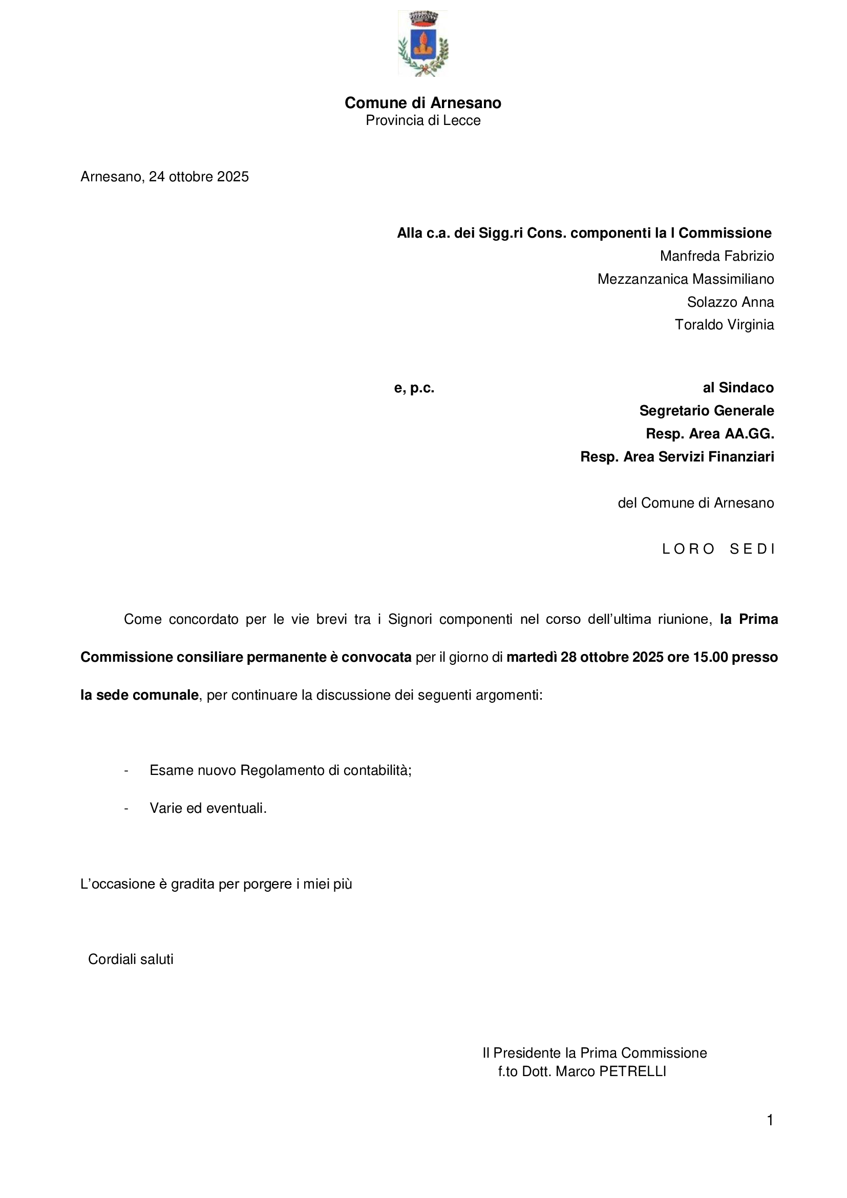 in data 28 ottobre ore 15.00 presso la Sede comunale