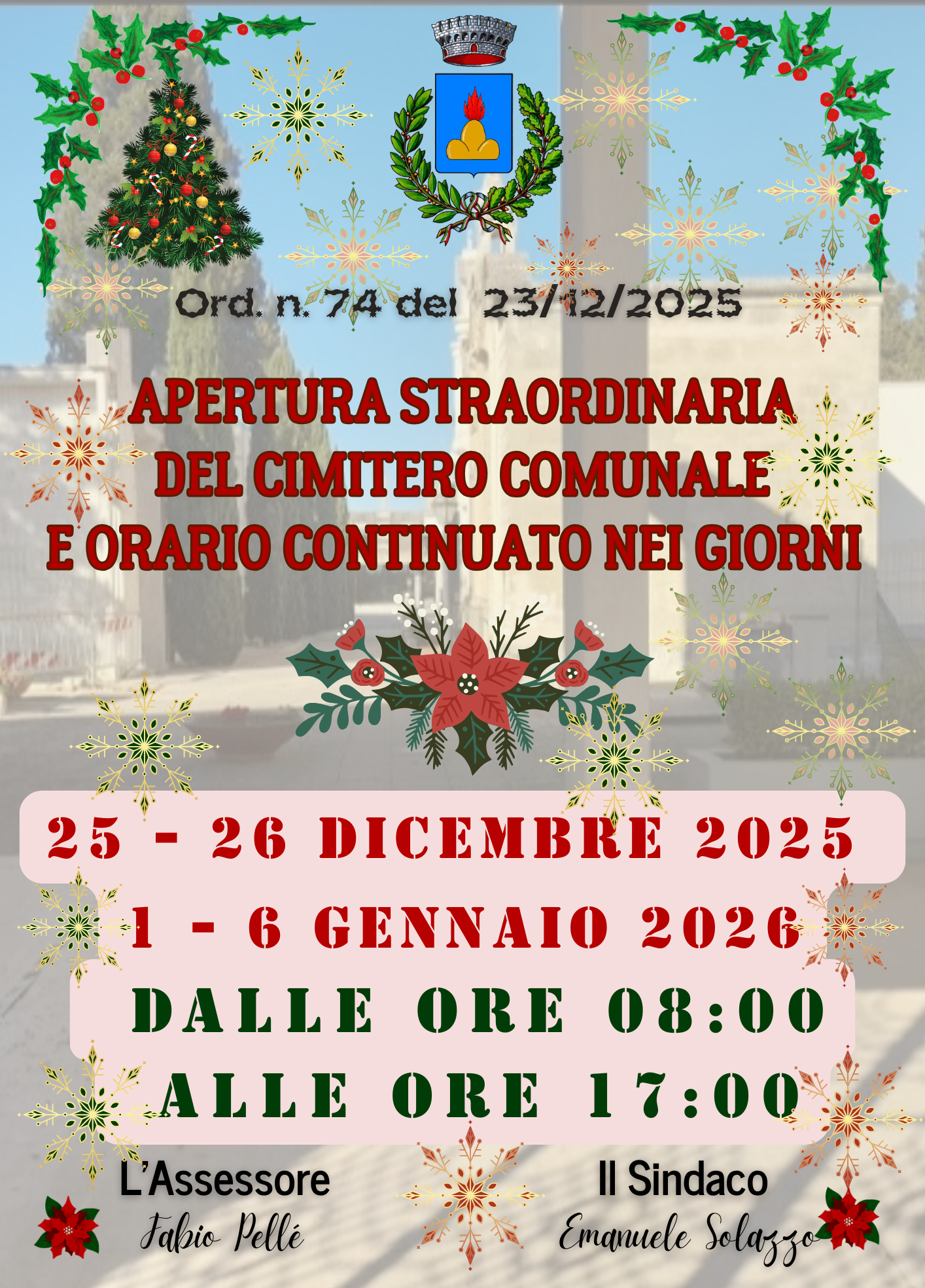 Si avvisa la cittadinanza che, con Ordinanza Sindacale n. 74 del 23.12.2025, l’Amministrazione comunale ha disposto l’apertura straordinaria del Cimitero comunale nei giorni di giovedì 25 dicembre 2025 e giovedì 1° gennaio 2026, nonostante la consueta chiusura del giovedì.
