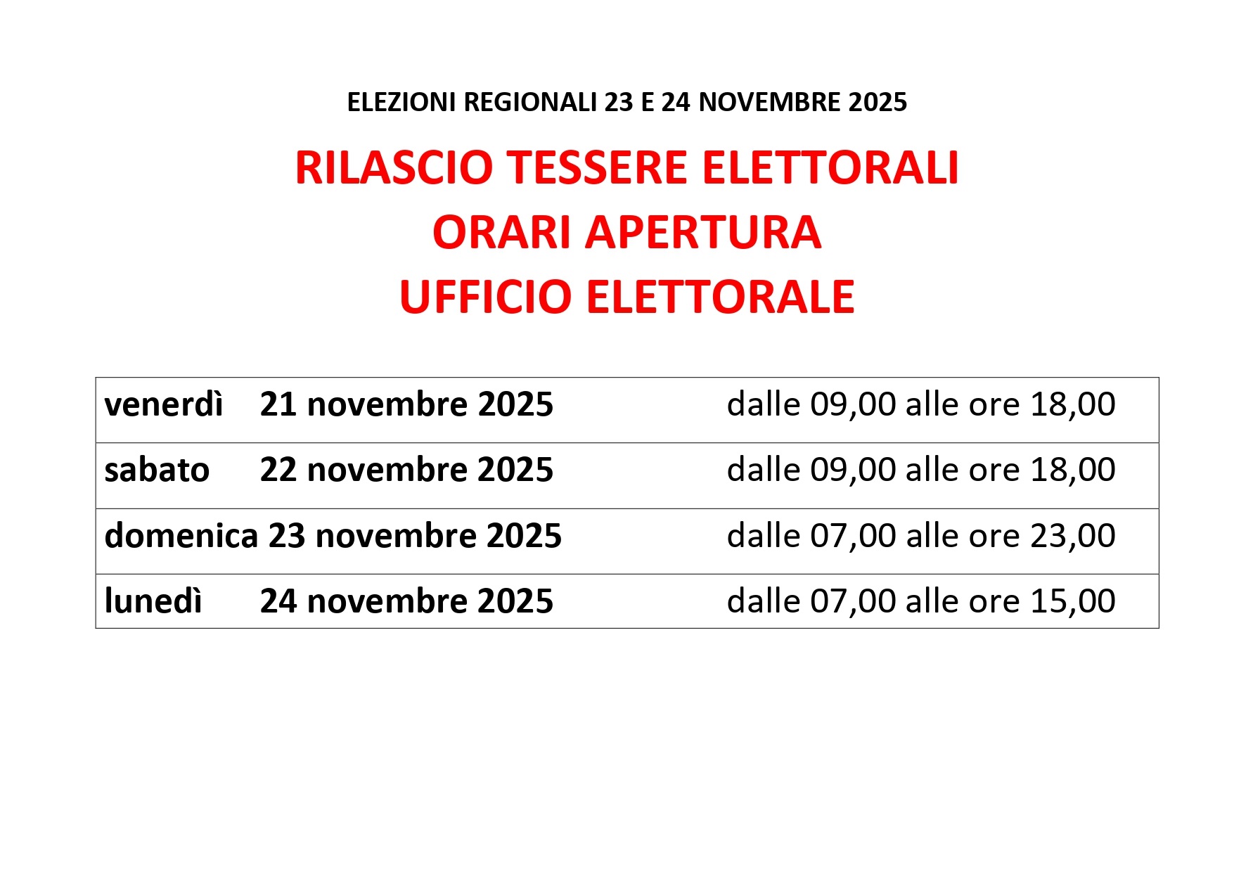 In occasione delle Elezioni regionali l'Ufficio Elettorale osserverà i seguenti orari per il rilascio delle Tessere Elettorali: