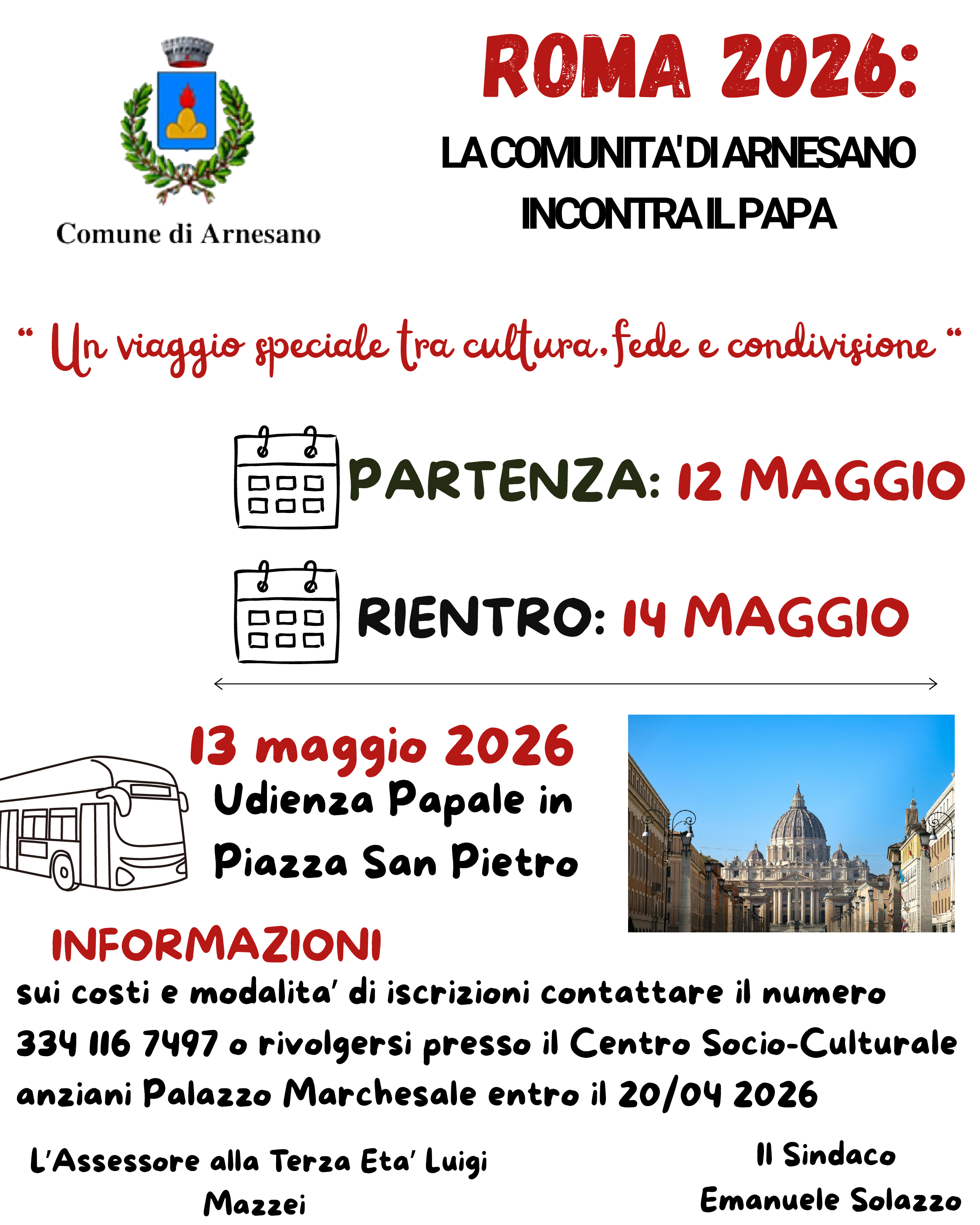 Sistemazione in camera doppia euro 65,00 al giorno e per persona con pensione completa, il costo relativo al trasporto di A/R per Roma sarà pagato in parte dal Comune di Arnesano.